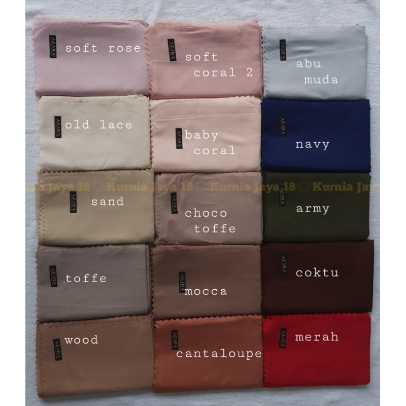 Produk ini memiliki 20 Variasi Warna yaitu : Soft gold,Green grey,Hijau botol,Hitam,Biru BCA,Old lace,Maroon,Choco toffe,Baby coral,Dark grey,Wood,Pink,Doff coral 2,Navy,Soft coral,Soft rose,Sand,Toffe,Baby Army,Abu muda,